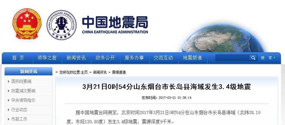 烟台长岛海域凌晨发生3.4级地震 震源深度9千米