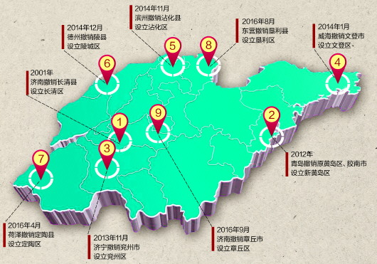 知事君梳理发现,自2001年至今,山东已有10个地方先后撤市(县)设区。除此之外,聊城东阿、茌平县,邹平县,济阳县,日照莒县、五莲县,德州齐河县、临邑县等至少9个地方仍在撤县设区里“排队”。