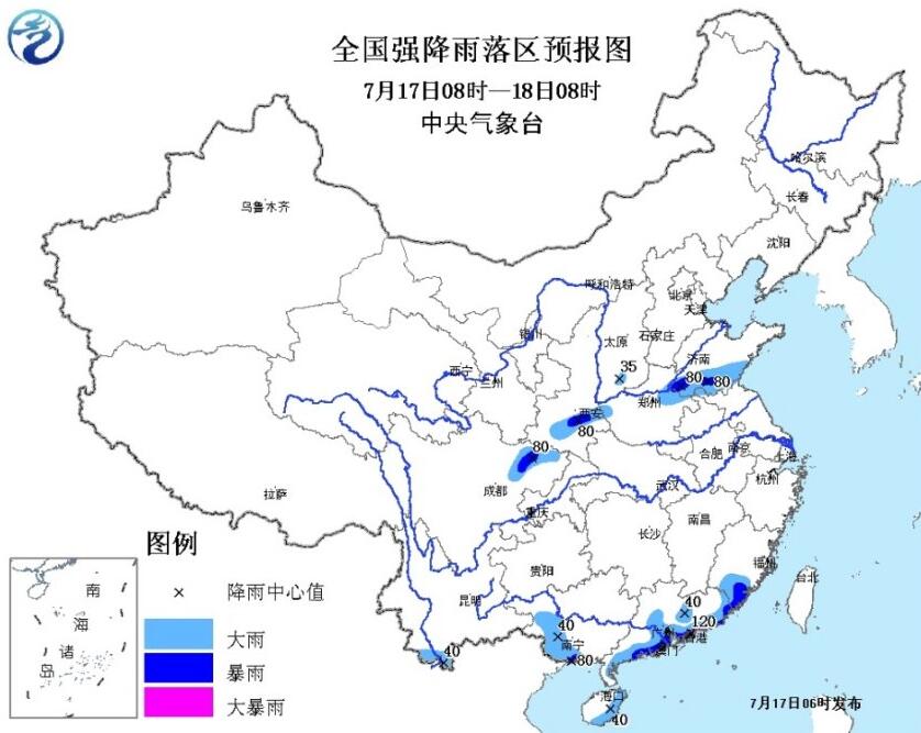 据中央气象台网站消息,中央气象台7月17日06时继续发布暴雨蓝色预警: