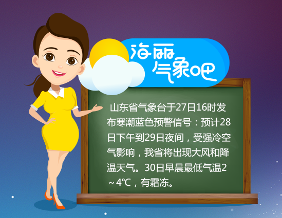 山东省气象台于27日16时发布寒潮蓝色预警信号:预计28日下午到29日夜间,受强冷空气影响,我省自西北向东南将出现大风和降温天气。北风,渤海、渤海海峡、黄海北部和中部7~8级阵风9~10级,半岛地区5~6级阵风7~8级,其他内陆地区4~5级阵风6~7级。