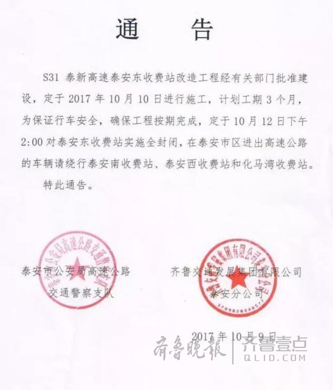 为保证行车安全,确保工程按期完成,定于10月12日下午2:00起对泰安东收费站实施全封闭,在泰安市区进出高速公路的车辆请绕行泰安南收费站、泰安西收费站和化马湾收费站。