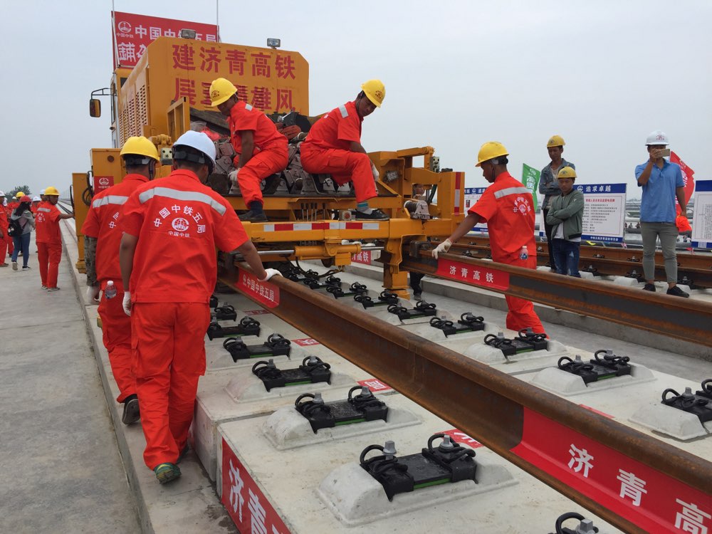 7月29日上午,随着铺轨机一声长鸣,中铁五局铺轨作业人员将首对500米长轨安全平稳地铺设到无砟轨道道床上,我国首条以地方为主投资建设的济青高速铁路正式进入铺轨阶段。