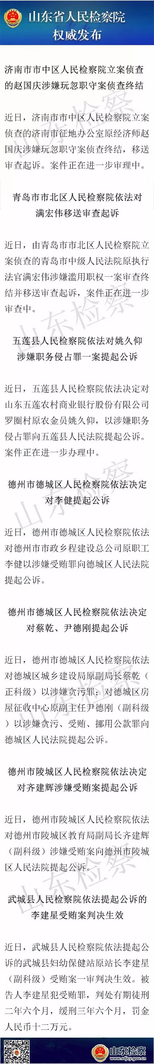 凤凰网山东5日下午从山东省人民检察院获悉,济南、青岛、日照、德州等地又有8人涉嫌职务犯罪被依法追究。