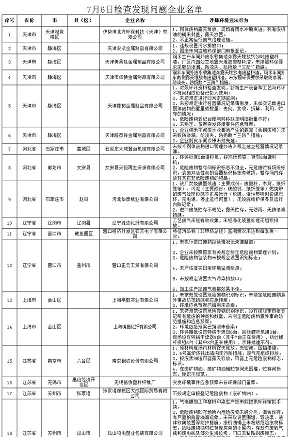 除7月9日晚通报的广东、江苏、山东、天津等12个省市外,河南、广西等地相继查出涉嫌违法企业。