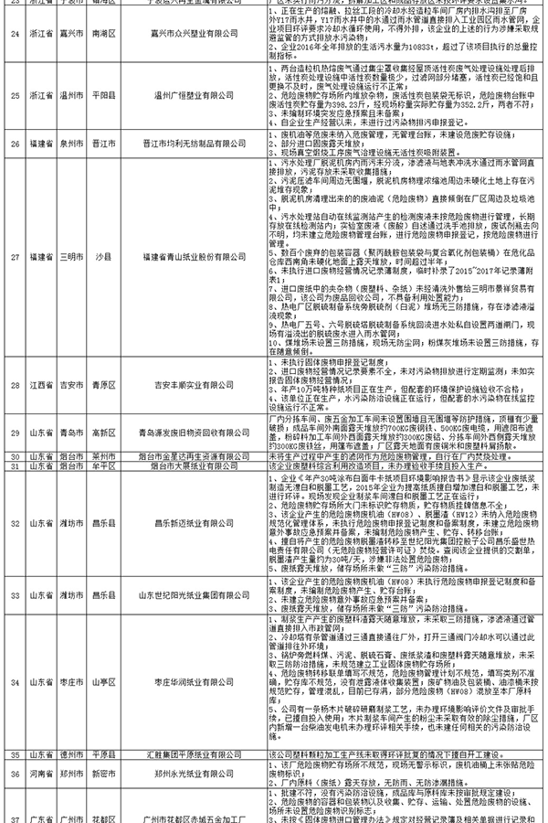 例如,河南省郑州市华丰工贸纸业有限公司排污申报项目不全,未包括危险废物和固体废物项目。天津市静海区佳俊金属制品有限公司增设的生物质燃料项目未批先建,废电线拆解、剥离物露天堆放。