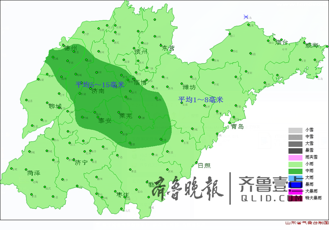 预计2日下午到夜间我省将有一次雷雨天气过程,其中济南、淄博、泰安、莱芜四市有小到中雨(5~15毫米)局部大雨并伴有雷电,其他地区有雷雨或阵雨(1~8毫米)。全省平均降水量3~8毫米。