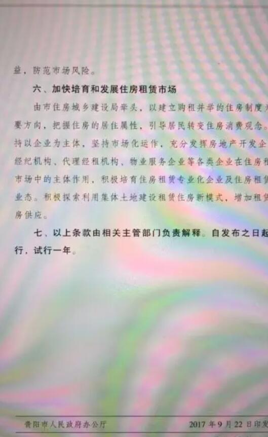 在这份名为《关于促进房地产市场健康稳定发展的若干措施(试行)》的文件当中,明确制定贵阳房地产市场下阶段将行措施,包括加强商品房销售管理、加强住宅用地供应统筹管理、加强住房公积金政策管理、购买新建商品住房3年内限制转让、加强二手房市场管理、加快培育和发展住房租赁市场等六大内容,这也意味着贵阳正式迎来“限售”时代。