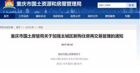 根据重庆市国土房管局发布的《关于加强主城区新购住房再交易管理的通知》要求,从9月23日起: