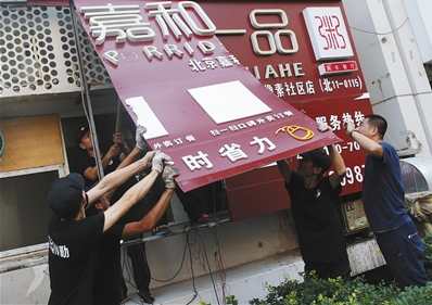 8月8日,北京朝阳区北京像素北区,执法人员正在摘除一家无照经营的饭店招牌。