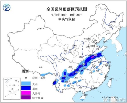 中央气象台9月9日18时继续发布暴雨蓝色预警[话筒]:预计9月9日20时至10日20时,四川、重庆、贵州、云南以及湖北、河南、山东、苏皖等地的部分地区有大雨或暴雨,其中,重庆、河南等地局地有大暴雨,上述部分地区有短时强降水,最大小时雨强40~60毫米,局地伴短时大风。另外,江南、广西、海南岛等地部分地区有分散性大雨或暴雨。请注意出行安全并注意防护[心]