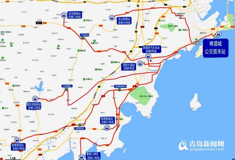 另外,新区增开西部镇街、功能区至金沙滩啤酒城8条定制公交线路,线路覆盖西海岸汽车总站(定制8号线)、国旅大酒店(定制9号线)、海青镇(定制10号线)、董家口港区(定制11号线)、理务关(定制12号线)、胶河经济区(定制13号线)、琅琊镇(定制15号线)、宝山镇(定制16号线)等地。其中,8号线、9号线票价10元/人,日发2班次;10-16号线票价12元/人,日发3班次。