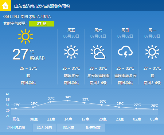 7月1日多云转雷阵雨,南风短时北风3~4级,气温26~32℃。