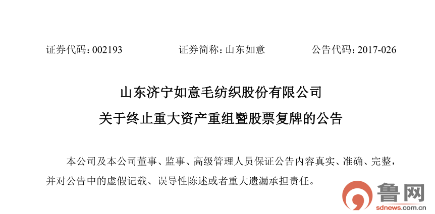 山东济宁如意毛纺织股份有限公司(山东如意.002193.SZ) )今天发布公告,公司股票停牌筹划重大收购事项,拟现金购买关联方持有的纺织服装企业部分股权,但由于外部不可控因素影响,公司认为收购标的公司部分股权的条件尚不成熟,公司决定终止筹划本次重大资产重组。公司股票于4月26日复牌。
