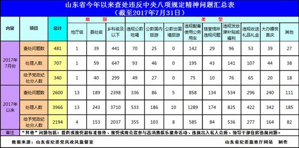 2017年以来,山东省各级纪检监察机关查处违反中央八项规定精神问题2600起,处理3966人,处分2194人。其中,7月份查处481起,处理707人,处分340人。
