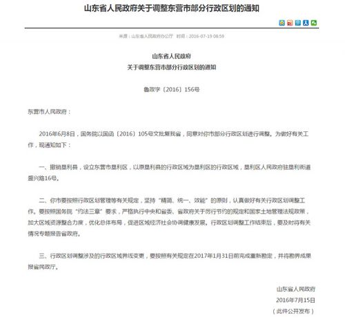 山东省人民政府网站7月19日发布通知,2016年6月8日,国务院以国函〔2016〕105号文批复山东省,同意对东营部分行政区划进行调整。撤销垦利县,设立东营市垦利区,以原垦利县的行政区域为垦利区的行政区域,垦利区人民政府驻垦利街道盛兴路16号。