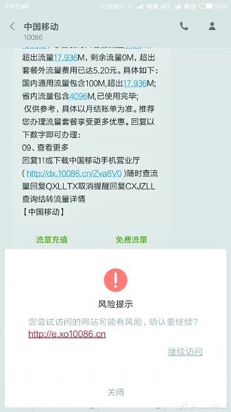 昨天,记者点开这条链接,页面马上弹出“访问的网站可能有风险”的提示。继续访问后,弹出一个显示“中国移动活动中心”的页面。页面中有充值100元送100元的活动提示。
