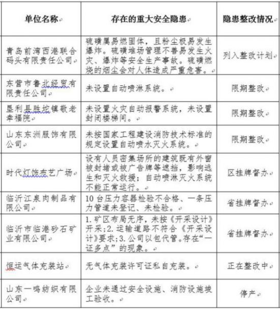9家存在重大安全隐患的生产经营单位分别为:青岛前湾西港联合码头有限责任公司、东营市鲁北经贸有限责任公司、垦利县胜坨镇敬老幸福院、山东东洲服饰有限公司、时代灯饰布艺广场、临沂江泉肉制品有限公司、临沂市临港砂石矿业有限公司、恒运气体充装站、山东一鸣纺织有限公司。其中青岛1家,东营4家,临沂2家,菏泽2家。