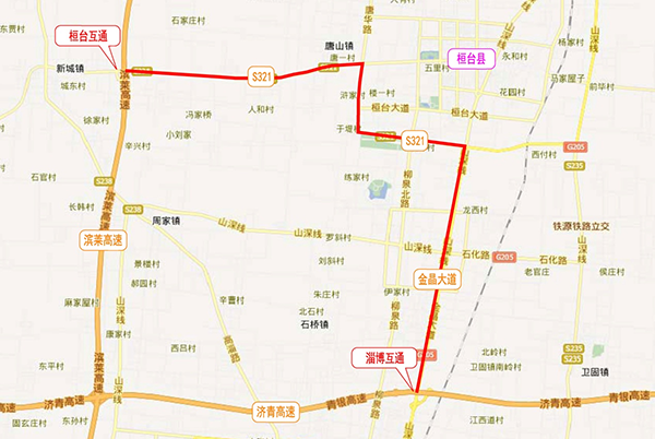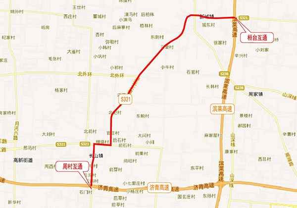 2.G20青银高速青岛方向转S29滨莱高速滨州方向封闭后,济南至滨州方向的车辆,需在G20青银高速周村收费站驶离高速,沿“范公”路向北行驶,沿S321(开元大道)向北行驶,经过新城镇后至S29滨莱高速桓台收费站进入S29滨莱高速,绕行距离约为16.6公里。