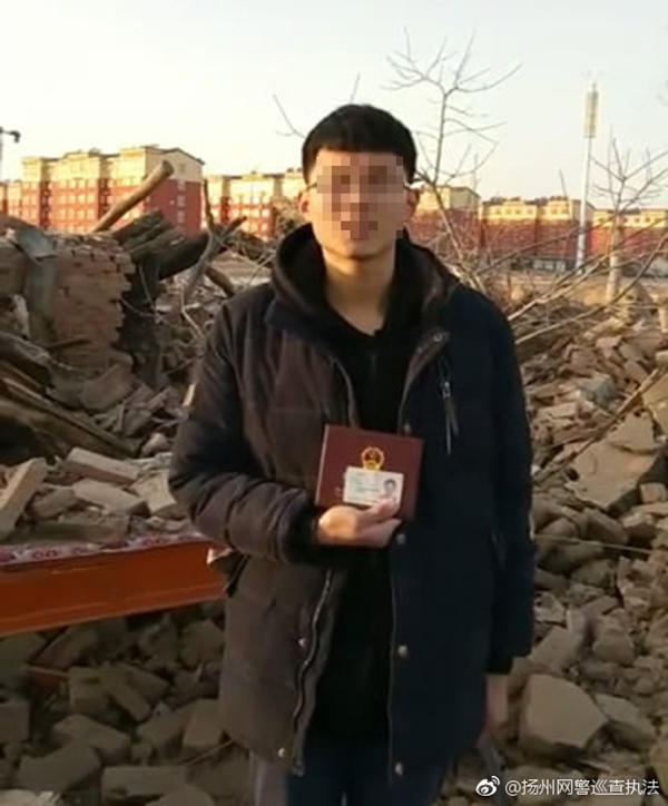 近日,一名高中生手持身份证和户口本录制了一段视频,称未接到拆迁通知自家房子被强拆。官方称其为不实信息。 微博@扬州网警巡查执法 图