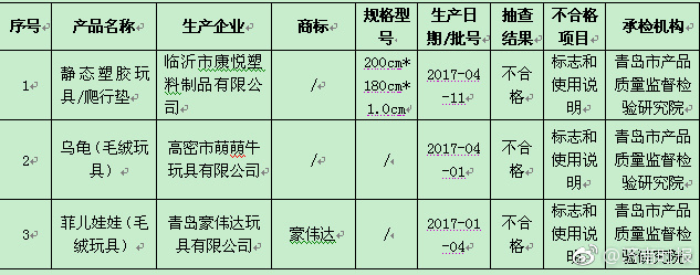 抽查发现,临沂市康悦塑料制品有限公司、高密市萌萌牛玩具有限公司、青岛豪伟达玩具有限公司等3家企业的静态塑胶玩具/爬行垫、乌龟(毛绒玩具)、菲儿娃娃(毛绒玩具)等3批次产品不符合相关标准的要求,不合格项目涉及标志和使用说明一项。