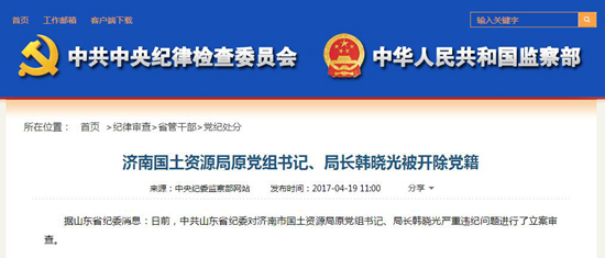 据山东省纪委消息:日前,中共山东省纪委对济南市国土资源局原党组书记、局长韩晓光严重违纪问题进行了立案审查。