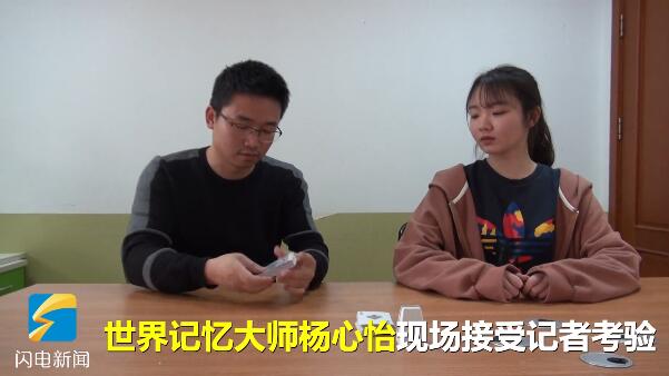 为了见证记忆大师的功力,记者现场当起了考官。将一副全新的扑克牌随机洗乱,根据比赛规则,杨心怡需要在两分钟内完成对这副扑克牌的记忆,随后,用另一幅扑克牌对记忆顺序进行还原。仅仅用时1分钟,杨心怡就正确记住了整副扑克牌,而她记忆一副扑克牌的最好成绩是45秒。面对摄像机镜头,杨心怡顺利完成了记者现场给出的测验,52张扑克牌完全正确还原。其实,这只是杨心怡平时训练的项目之一。