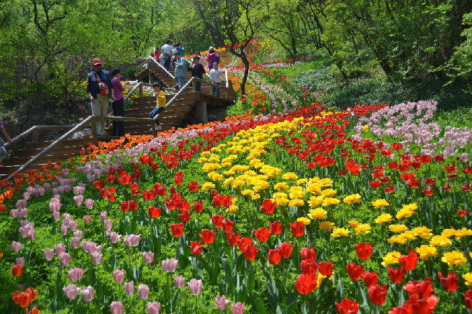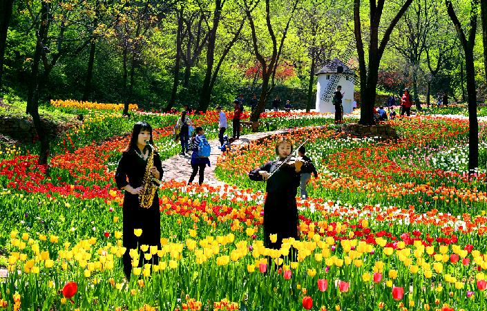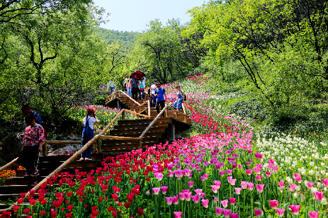 济南红叶谷景区五颜六色的郁金香花布满整个欧洲风情谷,全国各地的游客朋友们纷纷参与到了这场郁金香花的视觉盛宴里,漫步其中,流连忘返。景区还准备了多姿多彩的节庆活动,游客朋友们在欣赏美景的同时还感受到了节日的气氛。