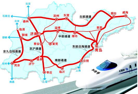“十三五”期间,山东将全面启动环山东半岛城市群高铁网规划建设,重点建设济青高铁、鲁南高铁、济南至聊城、潍坊至莱西以及济南至滨州、东营等高铁项目,建成“两横两纵双辐射”的高铁网,基本形成以济南、青岛为中心的“1、2、3小时”高速铁路交通圈,实现市市通高铁。实现上述目标,山东省需在“十三五”期间新建、续建高铁里程1450公里,总投资2200多亿元。