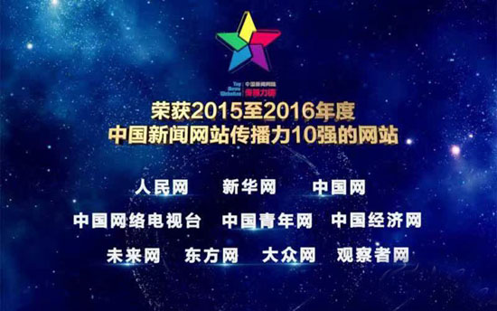 进入“2015-2016年度中国新闻网站传播力十强”的网站分别是:人民网、新华网、中国网、中国网络电视台、中国青年网、中国经济网、未来网、东方网、大众网、观察者网。该榜单打破了“中央、省级、行业”的类别界限,对所有网站的传播力指数进行综合考量并排名,中国经济网位列总榜第六位。