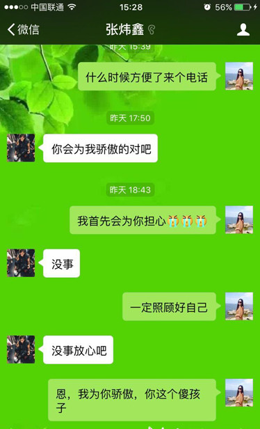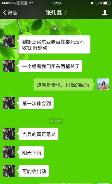“你会为我骄傲的对吧。”“到街上买东西老百姓都死活不收钱,好感动。”“第一次体会到当兵的真正意义。”这是一名莱州小伙子和姨妈的微信聊天记录。小伙子名叫张炜鑫,今年20周岁,是安徽武警特警部队的一名战士,和“美丽大脚”的拥有者焦磊是战友。近日,当这几张微信记录截图被他的家人分享到朋友圈后,很快获得了许许多多的留言和点赞,感动了众多烟台人。