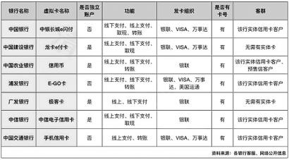 据不完全统计,目前在线销售的银行系虚拟信用卡产品包括建设银行的龙卡e付卡、农业银行的信用币、中国银行的中银长城e付、交通银行的手机信用卡、中信银行的中信电子信用卡、浦发银行的E-GO卡、广发银行的极客卡。《金融投资报》记者梳理发现,目前7家银行虚拟信用卡中,建设银行的龙卡e付卡、广发银行的极客卡属于主卡型虚拟卡,用于独立完整的主账户,不依赖于实体信用卡。其中,龙卡e付卡可通过在线申请,有卡客户可以通过建行微信银行办卡。办卡成功后,客户通过短信验证获取卡号、有效期、安全码等信息,即可在手机银行或个人网银进行安全绑定后使用。