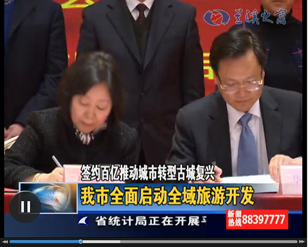 2月26日,陈伟代表中国景易集团,与兰溪市政府签订全域旅游合作开发(投资)协议。(图片来源:兰溪新闻广播电视台新闻截屏)