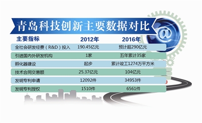 数据显示:2012年,我市全社会研发经费(R&D)投入190.45亿元。2015年达到了263.7亿元,增长了大约38%。2016年,全市研发经费占生产总值比重预计2.9%左右,超290亿元;2012年,我市引进的国内外研发机构只有一家,而截至2016年底,我市“十二五”以来累计引进的国内外科研院所已达35家;2012年,全市孵化器建设刚刚起步,截至2016年底,全市孵化器累计竣工面积达1274万平方米;2012年,全市技术合同交易额只有25.37亿元。2016年,全市技术合同交易额首次突破百亿元,达到104亿元,与2012年相比翻了两番;2012年,全市发明专利申请12092件,发明专利授权1510件。截至2016年底,全市发明专利申请34953件,发明专利授权6561件,发明专利授权量、有效发明专利、PCT国际专利申请量三个指标的增幅均居副省级城市第一名……