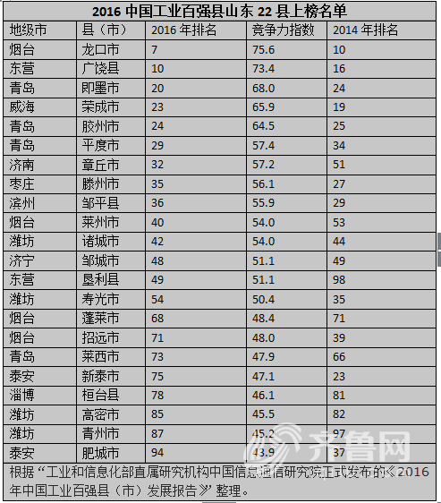 近日,工业和信息化部直属研究机构中国信息通信研究院正式发布《2016年中国工业百强县(市)发展报告》,山东省共有22个县(市)上榜。青岛、潍坊和烟台各有4个县(市)入围。其中,龙口市位列第7位,在山东省22个上榜县(市)中位列第1位。