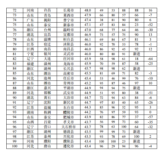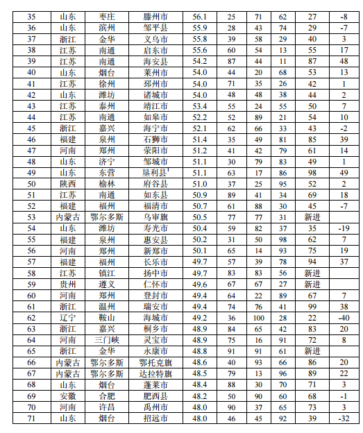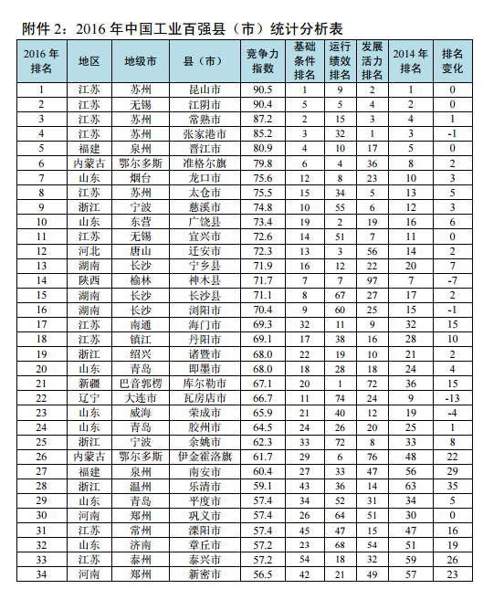 报告称,课题组形成了由3大支柱(基础条件、运行绩效、发展活力)、9大支点(产业规模、产业结构、产城融合、劳动绩效、资本绩效、绿色绩效、投资积累、技术创新、两化融合)和28个指标构成的县域工业竞争力评价指标体系,同时依托制造强国产业基础大数据平台,通过对2016年各县(市)工业竞争力进行实证分析和比较研究而形成该榜单。据了解,2016年工业百强县(市)分布于18个省份。其中,山东22个,江苏20个,浙江13个,河南9个,福建7个,辽宁、内蒙古各5个,河北、湖南各4个,湖北、陕西各2个,广东、安徽、山西、江西、宁夏、贵州、新疆各1个。排名前十的县(市)分别为昆山市、江阴市、常熟市、张家港市、晋江市、准格尔旗、龙口市、太仓市、慈溪市、广饶县,江苏共计5个县(市)进入十强,山东2个,福建、内蒙古、浙江各有1个进入。