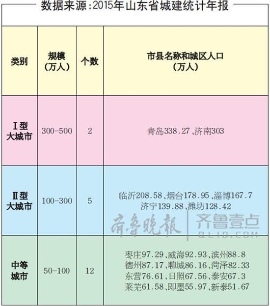 在省政府网站公布的全省市县城区人口规模表中,人口超过百万的城市共有7个。其中济南、青岛是I型大城市,人口分别为303万和338.27万。临沂、烟台、淄博、济宁和潍坊5市的城区人口规模在100万至300万之间,属于Ⅱ型大城市。