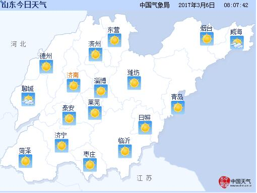 7日(周二),全省天气晴到少云。渤海、渤海海峡、黄海北部和中部北风6~7级阵风8级;半岛地区北风4~5级,鲁西北和鲁中地区北风3~4级,其他 地区南风转北风3~4级。最低气温:鲁西北、鲁中山区和半岛内陆地区-3℃左右,其他地区0℃左右。8日(周三),全省天气晴到少云。渤海、渤海海峡、黄 海北部和中部北风6~7级阵风8级减弱到5~6级,半岛地区北风4~5级,其他地区北风短时南风3~4级。最低气温:鲁西北、鲁中山区和半岛内陆地区 -1℃左右,其他地区1℃左右。
