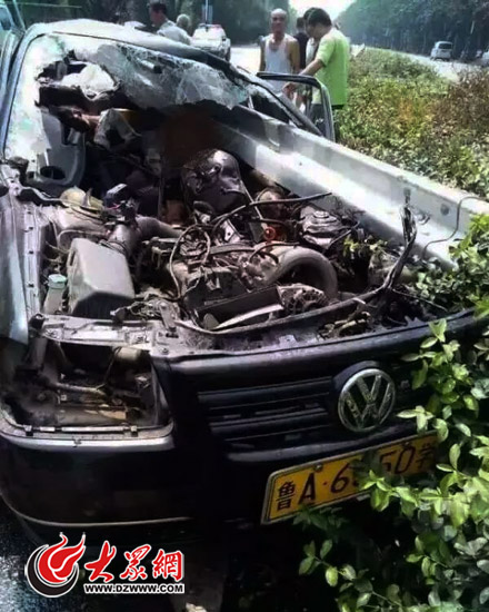 事故发生在今天中午11点多左右,当时黑色桑塔纳教练车左侧撞上了路边的钢制防护栏,断裂的防护栏掀掉前引擎盖后又从驾驶座穿入,从后排左侧穿出,前后挡风玻璃都被击碎。从现场照片来看,撞击导致车顶隆起、左侧车门掉落,引擎盖下的多种管线断裂,整车已经完全报废。