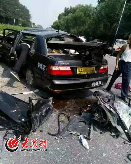 事故目前已造成1死3伤,现场散落着被撞掉的的引擎盖、车门。