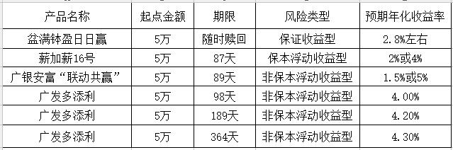 自入驻东营以来,广发银行始终坚持创新服务措施,坚持以客户为中心的服务理念。广发银行将以良好的服务和优质的服务欢迎大家的光临。广发银行近期销售理财产品如下: