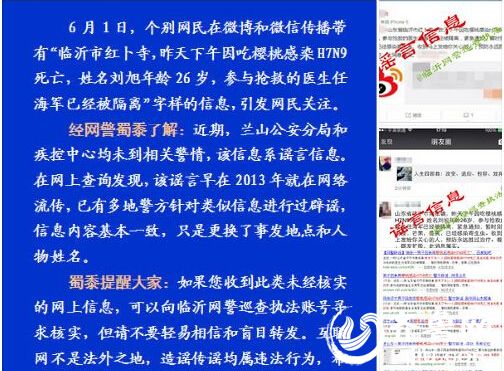 今天上午@临沂网警巡查执法对外出发公告称:6月1日,个别网民在微博和微信传播带有“临沂市红卜寺,昨天下午因吃樱桃感染H7N9死亡,姓名刘旭年龄26岁,参与抢救的医生任海军已经被隔离”字样的信息,引发网民关注。经临沂网警核实,此信息为谣言。