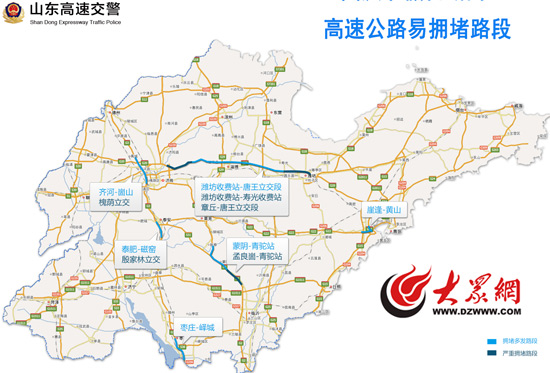 G20青银高速潍坊收费站-唐王立交段K150-K330,重点拥堵多发路段为潍坊收费站-寿光收费站K150-K180,章丘-唐王立交段K300-K330;