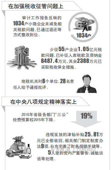 审计报告中提及,截至2017年2月底,审计工作报告反映的36类77项问题,67项已全部完成整改,其余10项正积极推进(已完成81%)。通过整改,上缴财政资金3.44亿元,盘活存量资金66.79亿元,412人和32个单位受到责任追究,追缴违纪违法资金5700.27万元。另外,审计工作报告反映的119名省管领导干部经济责任审计查出的问题已基本完成整改。