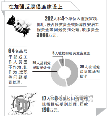 在整改中,严肃查处侵害群众利益问题。202人和4个单位因虚报冒领、挪用、侵占扶贫资金或保障性安居工程资金等问题受到处理,收缴资金3966万元。平邑县某村支部书记挪用财政补贴资金12.7万元,被判处拘役四个月。