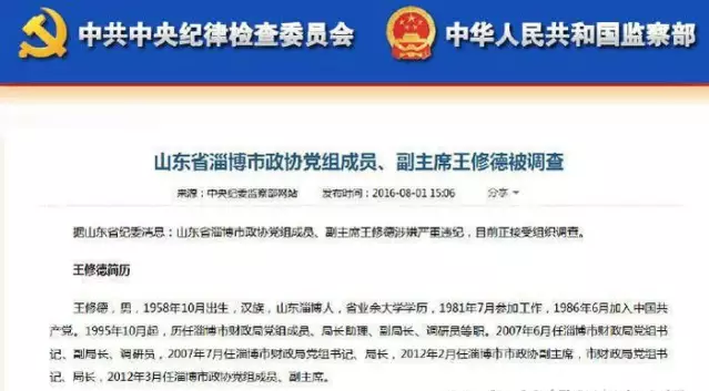 中央纪委监察部网站消息,据山东省纪委消息:8月1日,山东省淄博市政协党组成员、副主席王修德涉嫌严重违纪,目前正接受组织调查。据介绍:王修德是在工作时被纪委办案人员突然带走的。