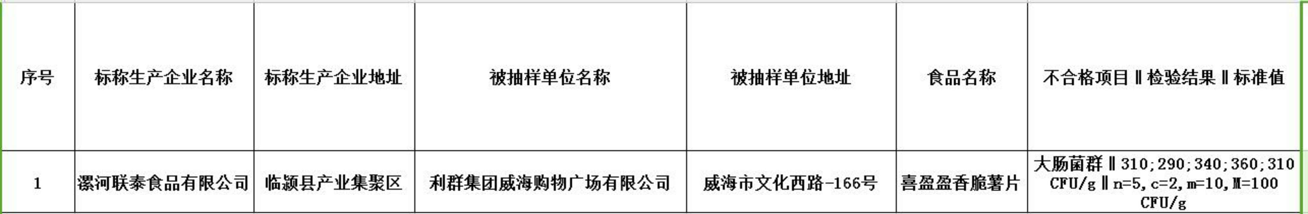 利群集团威海购物广场有限公司销售的标称漯河联泰食品有限公司生产的喜盈盈香脆薯片大肠菌群超标。