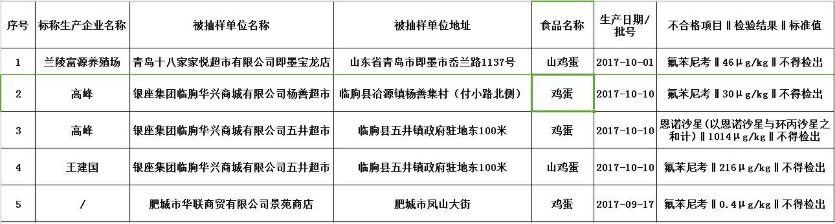 肥城市华联商贸有限公司景苑商店销售的鸡蛋氟苯尼考超标。