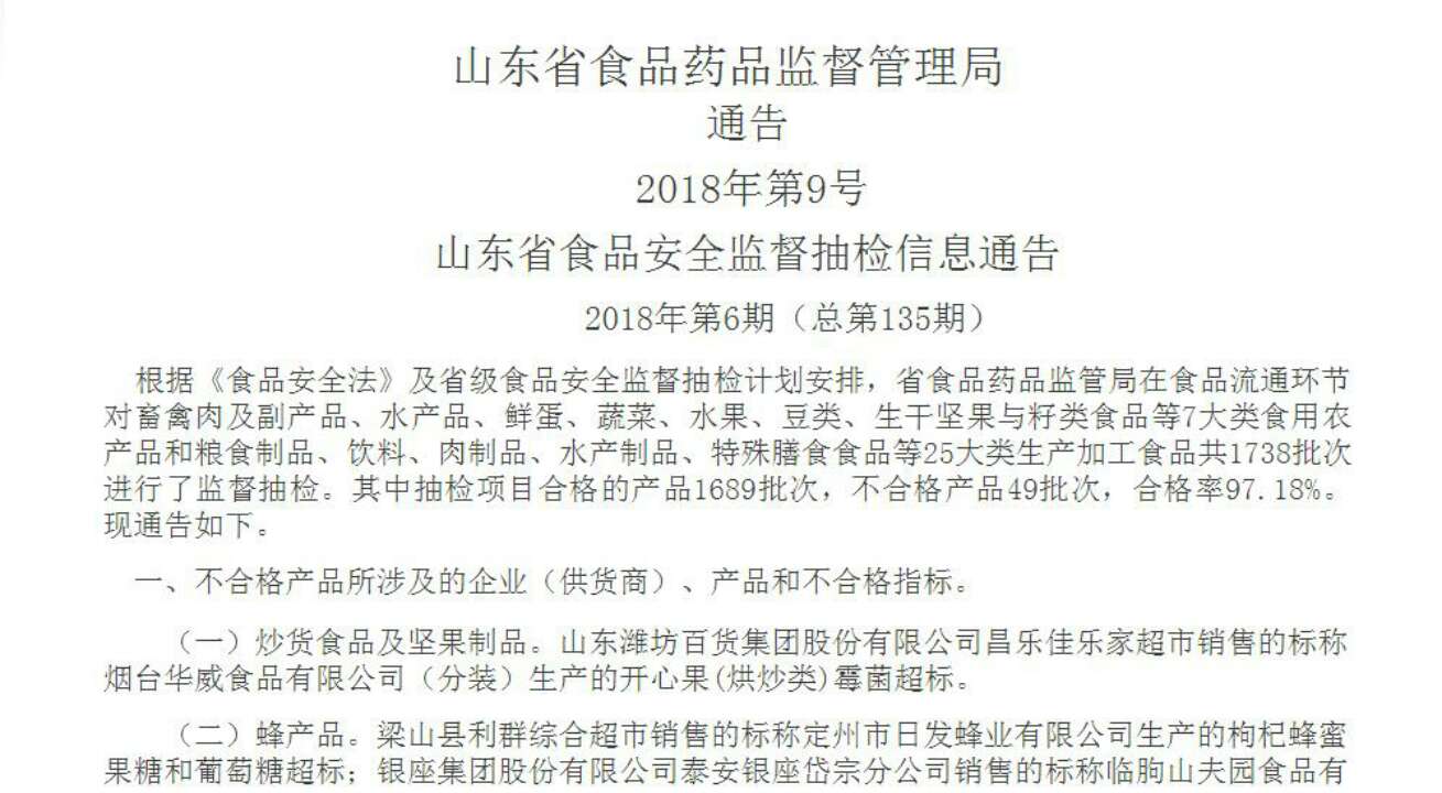 山东省食药监局24日通报2018年第9期食品抽检情况,49批次食品不合格,利群集团威海购物广场有限公司、银座集团股份有限公司泰安银座岱宗分公司、银座集团临朐华兴商城有限公司五井超市等销售的多批次食品检出不合格。