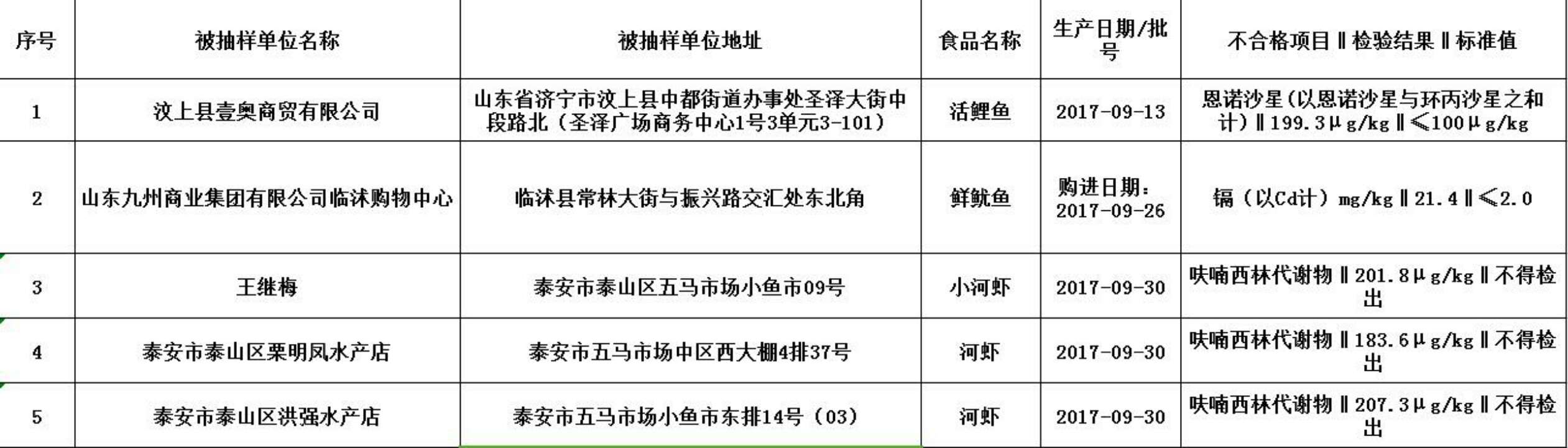 汶上县壹奥商贸有限公司销售的活鲤鱼恩诺沙星超标;