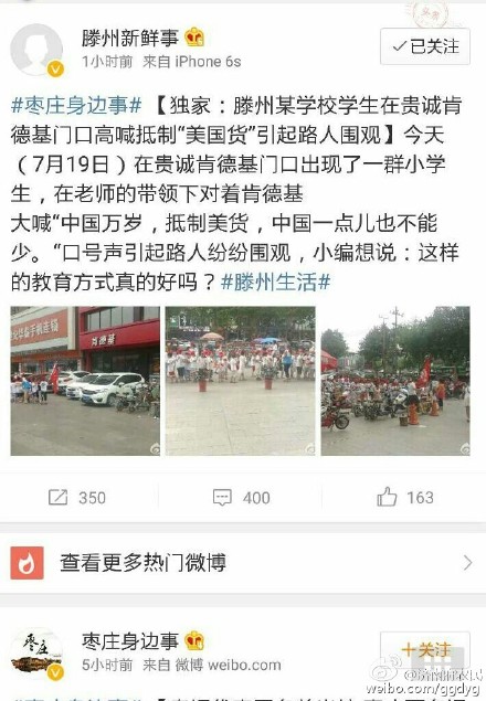 19日下午,微博名为@滕州新鲜事 的网友在其微博上发布了名为《独家:滕州某学校学生在贵诚肯德基门口高喊抵制“美国货”引路人围观》的微博,在网络上引起广泛关注。